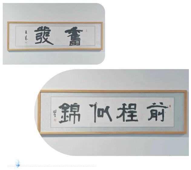 我们的故事,从教学区那承载着无数脚步的楼梯间开始。这里是每日必经的“上坡路”,是连接现实与梦想的第一级台阶。为了让每一步攀登都充满力量,校领导们殚精竭虑,多方奔走,最终特邀天香书画院的德高望重的艺术家们,为我们北华的莘莘学子亲笔题字。“行行出状元”的多元期许,“奋发”的昂扬呐喊,“厚德载物”的品格教诲……这些词语,并非简单的装饰,而是艺术家们将对下一代的关爱与祝福,倾注于笔端,凝结成力透纸背的墨迹。这背后,更是校领导为孩子们打造精神高地的良苦用心,他们希望孩子们在每日的耳濡目染中,懂得成才之路不止一条,但无论选择哪一条,奋发图强的精神和厚德载物的品格,都是行稳致远的基石。