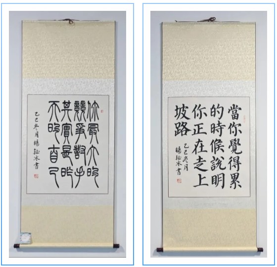 正对楼道的墙面上,是书法老师用古朴典雅的篆体写下的两句箴言:“当你觉得累的时候,说明你正在走上坡路”和“你最大的竞争对手,其实是昨天的自己”。这两句话,源自王校长深夜在微信工作群里的一次分享。这份跨越时空的叮咛,是他结合自身阅历,对这群正处于青春拔节期的孩子们最殷切的期望。它像一盏明灯,穿透屏幕的微光,照亮了老师们的心,也照亮了孩子们可能遇到的迷茫与疲惫,告诉他们,奋斗的艰辛恰恰是成长的证明。更令人动容的是,我们的书法杨老师,将这份校长的线上关怀内化为自己的行动,利用宝贵的私人休息时间,购置了最能承载墨韵的书写纸和古朴典雅的条幅,将这份沉甸甸的期许,一笔一画、满怀虔诚地镌刻在墙上。这份不计回报的纯粹付出,是师者仁心最质朴、最光辉的写照,它让孩子们在仰望文字的同时,更深刻地感受到,成长的路上,总有温暖的目光在默默守护,总有坚实的臂膀在背后支撑。