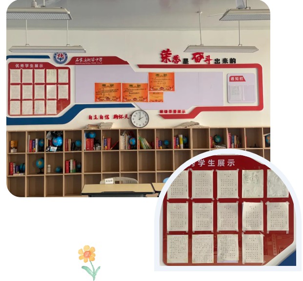 教室的后方,是荣誉与梦想的殿堂。荣誉墙上,军训时的飒爽英姿、运动会上的奋力拼搏、学习小组的累累硕果,一张张奖状熠熠生辉,记录着集体的荣耀与汗水,培养着孩子们的团队精神和集体荣誉感。而一旁的展示墙,则属于每一个努力的个体。一张字迹工整的作业、一份逻辑清晰的答题纸、一篇文笔优美的文章……每一份作品都被珍视、被展示。这面墙告诉孩子们:成功并非只属于冠军,每一个努力的瞬间,每一次进步的足迹,都同样值得被喝彩,被看见,被珍视。