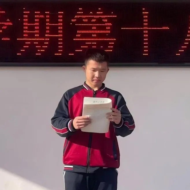 高二七班的杨佳雨同学走上主席台,他的声音清澈而坚定。“岁末临近,年味渐浓,我们即将告别忙碌充实的校园生活,奔赴充满期盼的新春佳节。”他以“凝心筑安全,聚力赴新春”为主题,将安全比作新春最美的底色,提醒大家虽然假期将至,但安全意识不可松懈。他呼吁同学们主动学习安全知识,将安全意识根植心中,在家里、在社区、在校园都能承担起安全责任,让每个人的力量汇聚成温暖的安全防线。最后,他送上对全体师生的新春祝福,期盼大家带着平安与健康奔赴团圆之约。